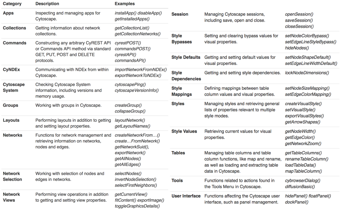 詳細については、Cytoscapeメニューバーの “Help -> Automation -> CyREST Commands API” を参照してください。