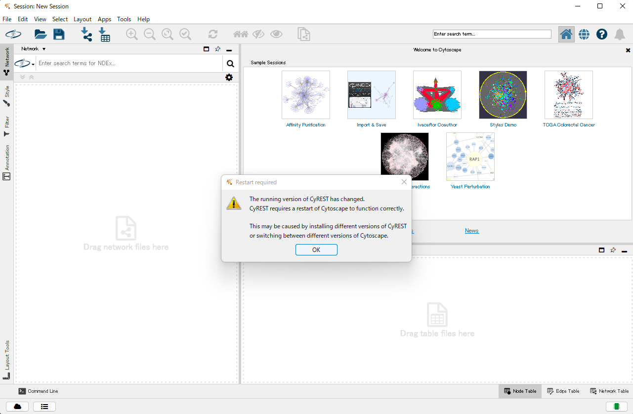 以下のコードを実行する前に、ローカルのCytoscapeが完全に起動しきっていることを確認してください。 Cytoscapeが起動し、RESTサーバーが完全に起動するまでには少し時間がかかります。 (大体10秒くらい待ちます。)