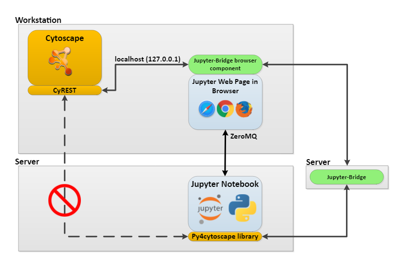 デスクトップ環境内のCytoscapeにリモート環境からアクセスするのは難しいため、Jupyter Bridgeを使用します。