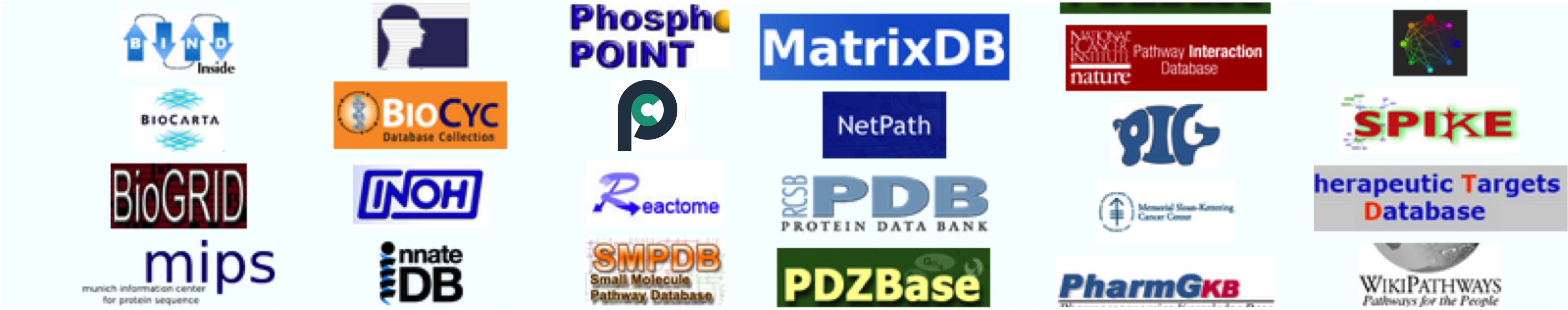 多くの特殊な(たとえば、特定の分子、相互作用の種類、または種の)相互作用データベースに加えて、これらのデータベースを照合して、より使いやすい幅広いリソースを作成するデータベースもあります。例えば: