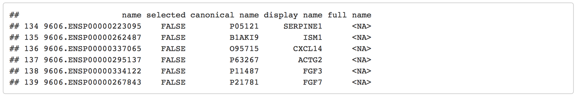 これを行うには、RCy3のloadTableData関数を使用します。 IDの種類が一致していることを確認することが重要です。 ノード属性テーブルの列名を取得することで、STRINGが何を使用しているかを確認できます。
